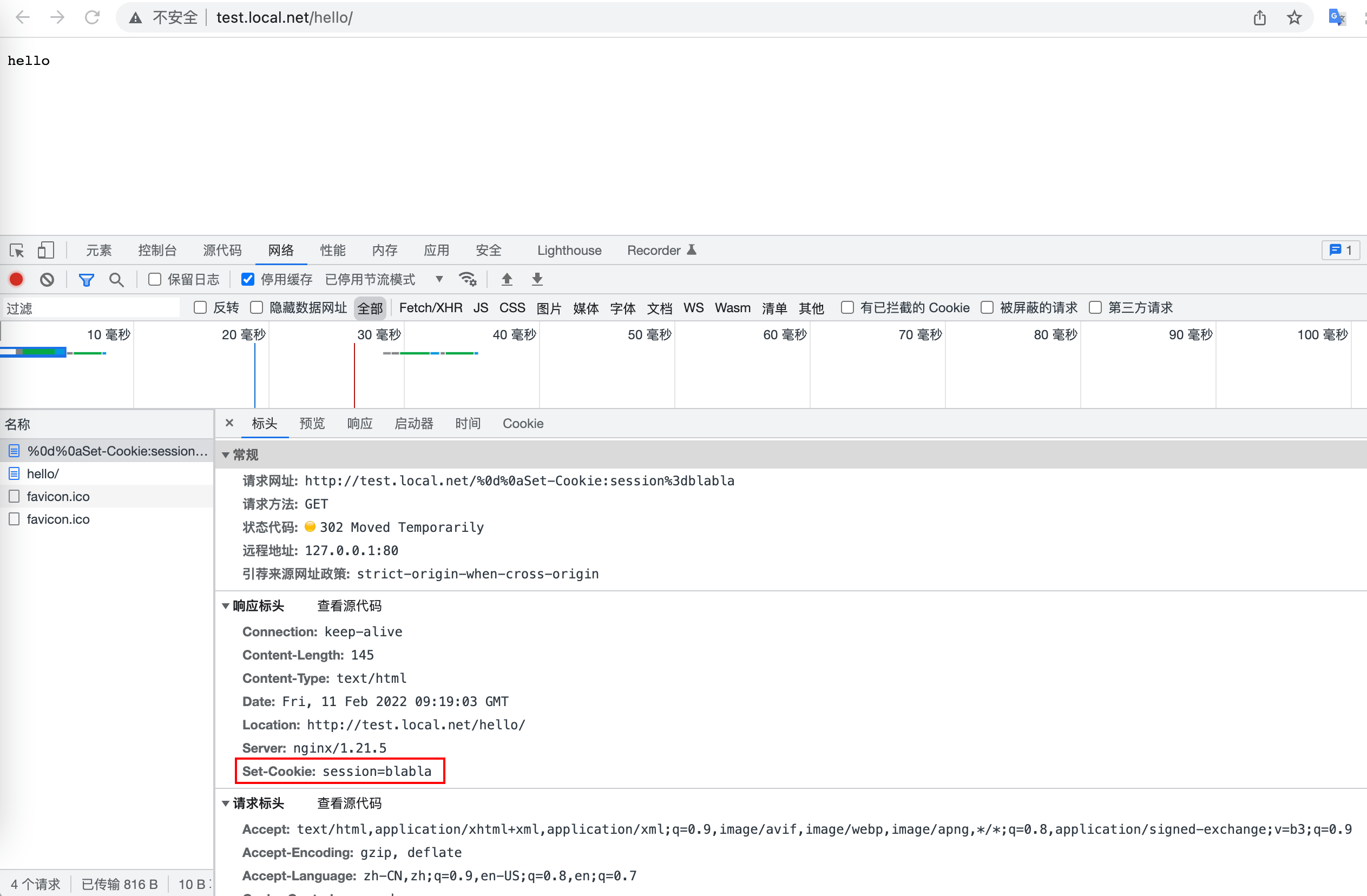 接下来,我们在浏览器中访问http://test.local.net/%0d%0aSet-Cookie:session%3dblabla